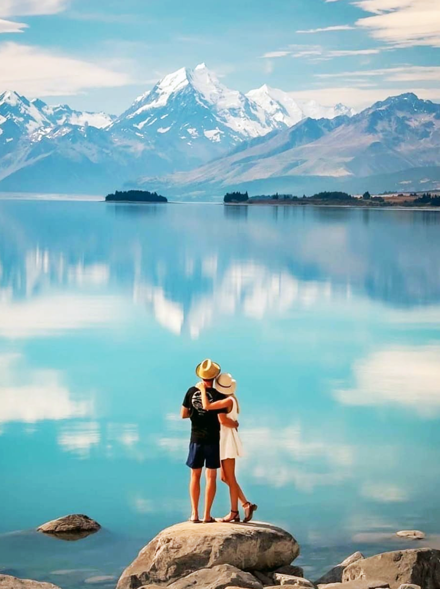 不远处的库克山,是新西兰的最高峰,山顶的积雪与山脚的草原、湖泊交织在一起,层次分明。
