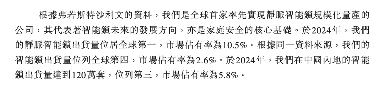 根据弗若斯特沙利文的资料,于2024年,鹿客科技的静脉智能锁出货量位居全球第一,市场占有率为10.5%。根据同一资料来源,公司的智能锁出货量位列全球第四,市场占有率为2.6%。于2024年,公司在中国内地的智能锁出货量达到120万套,位列第三,市场占有率为5.8%。