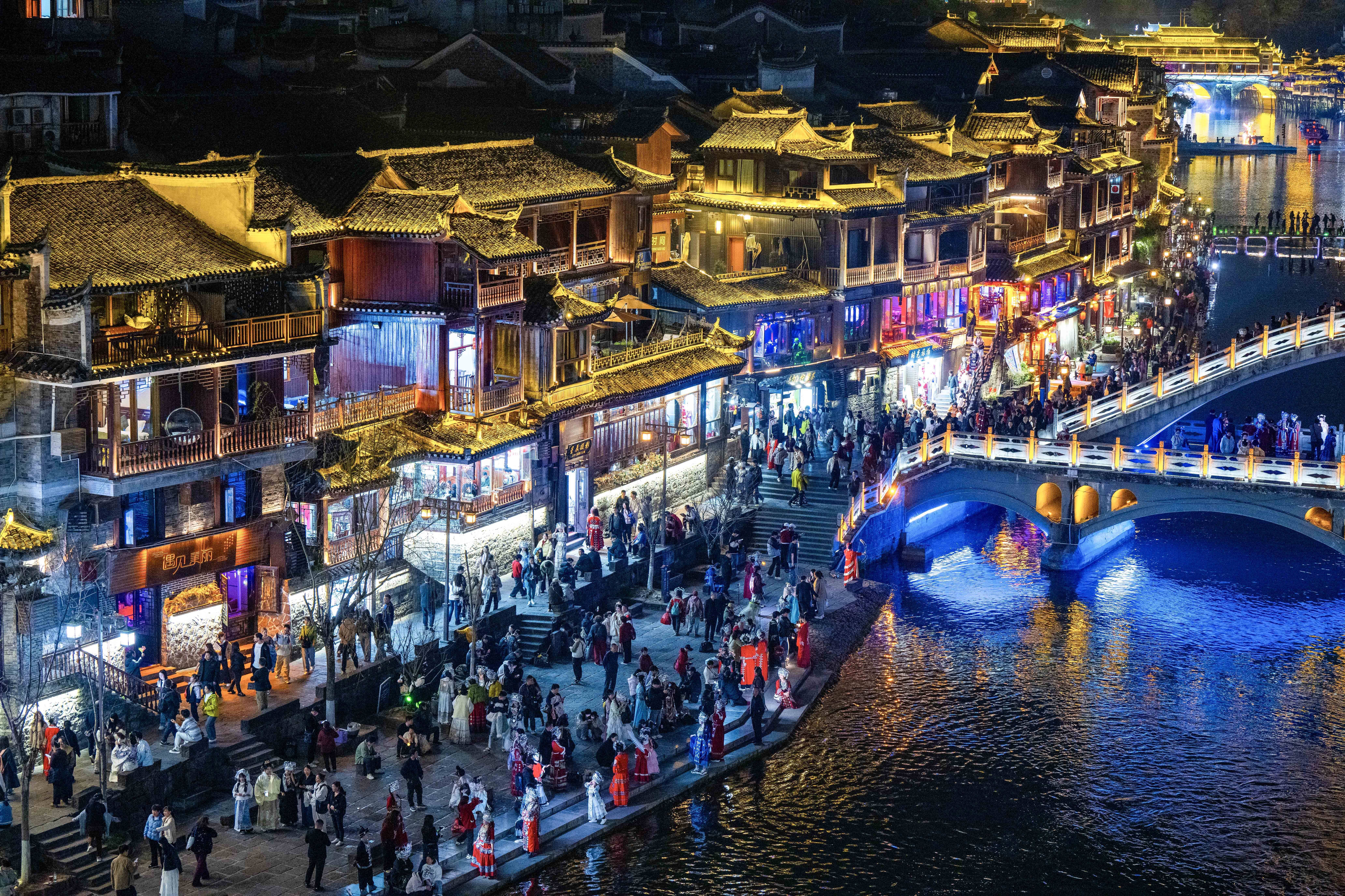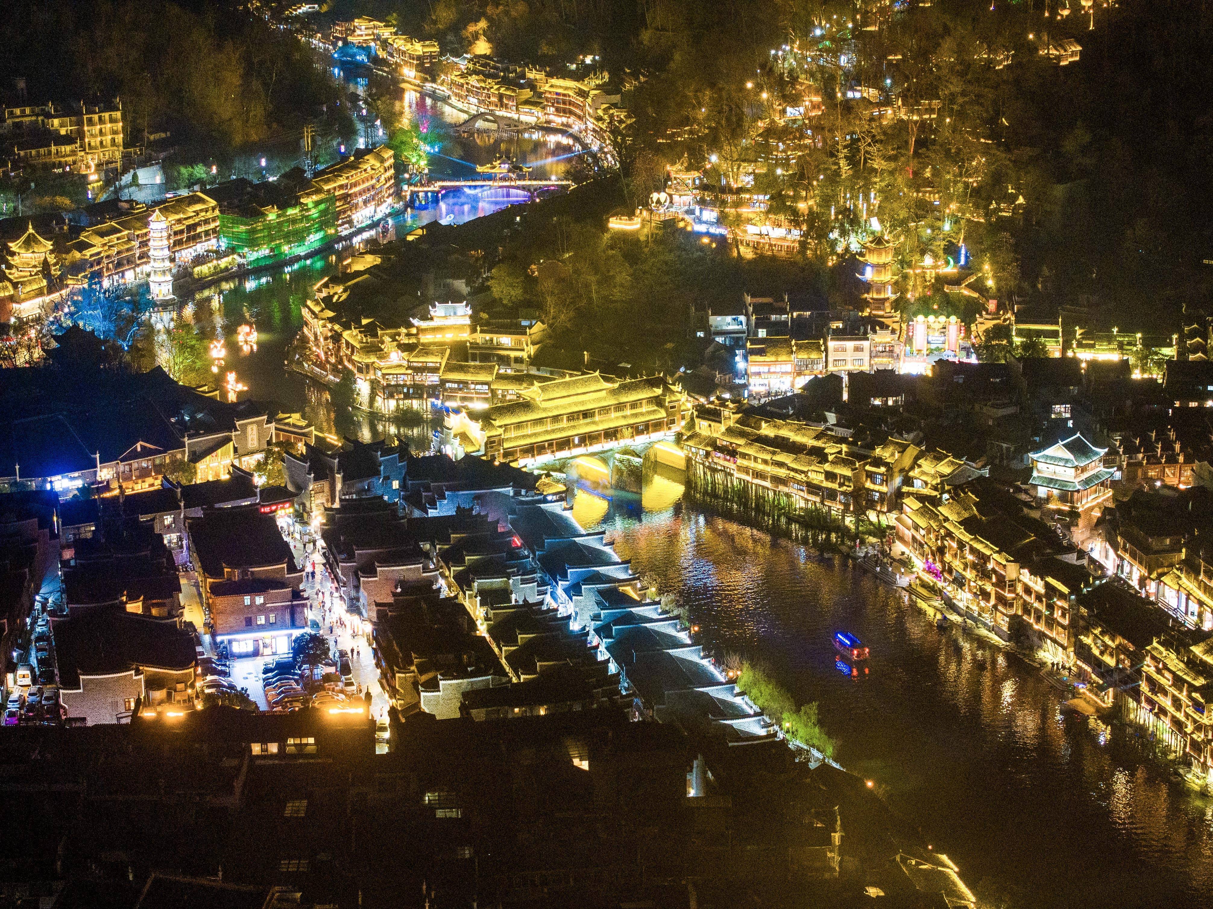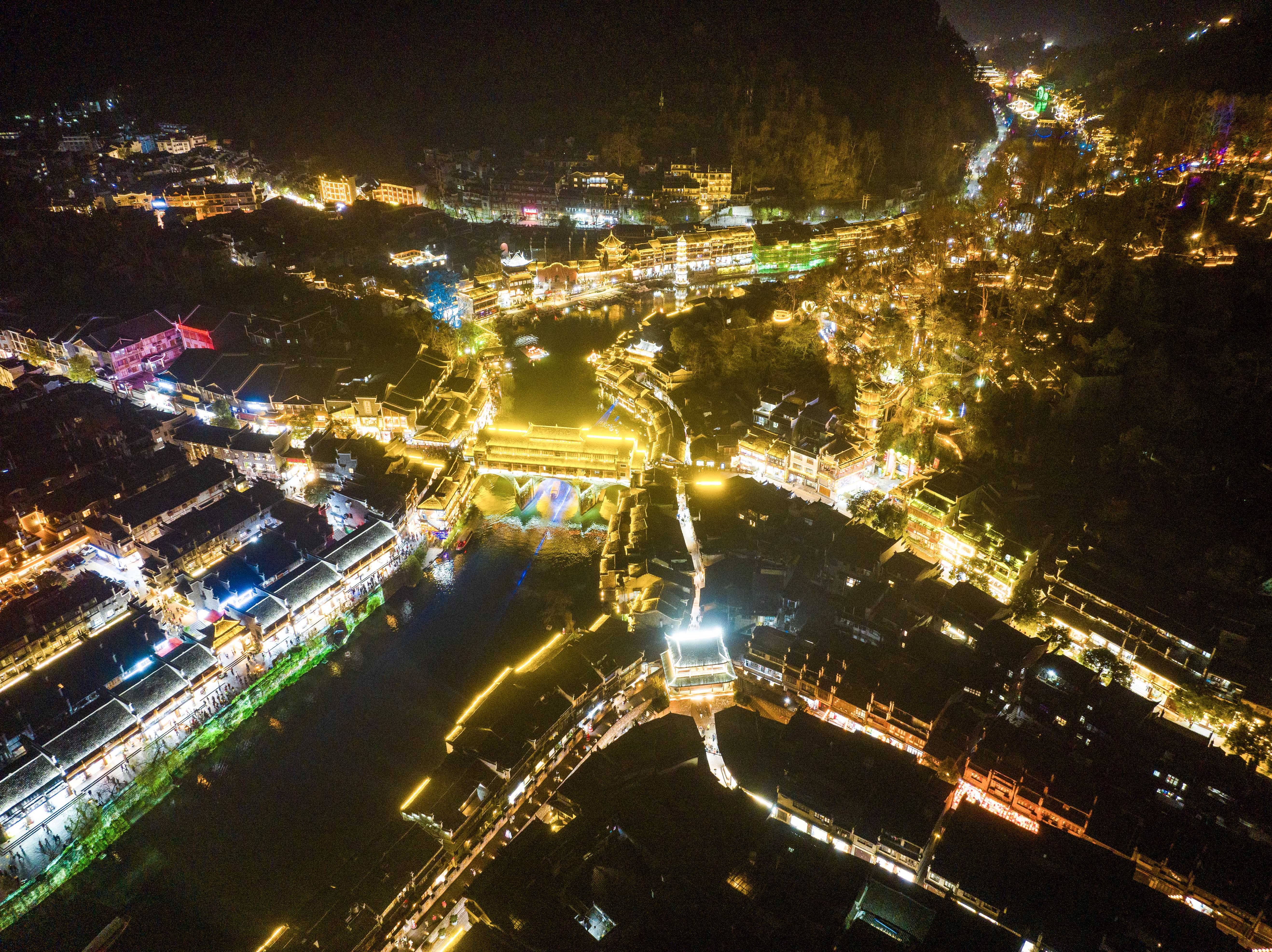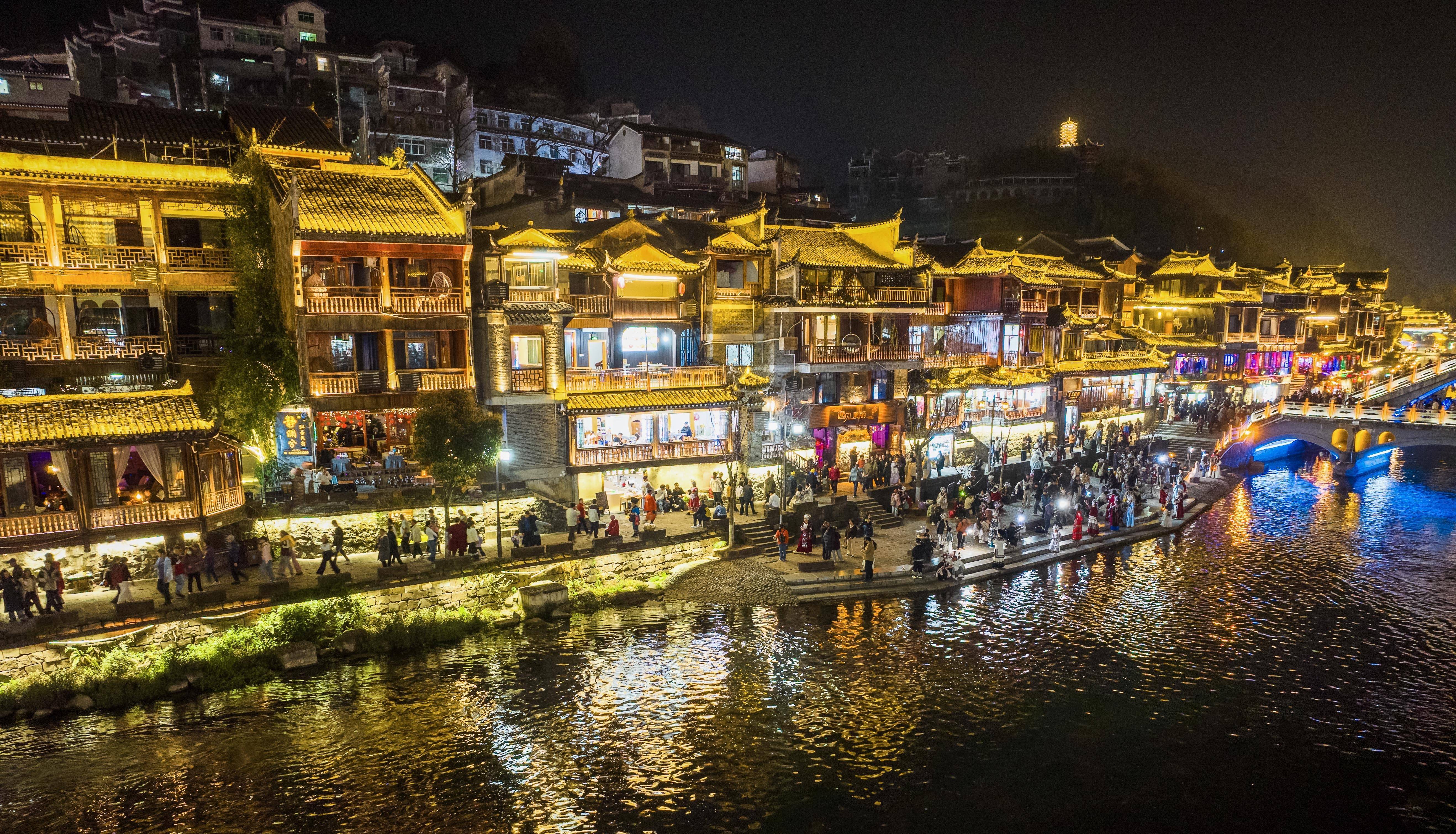 夜晚的湖南省湘西土家族苗族自治州凤凰古城,灯火璀璨,游人如织,水上的波光与古色古香的建筑相互映衬,别有一番景致。