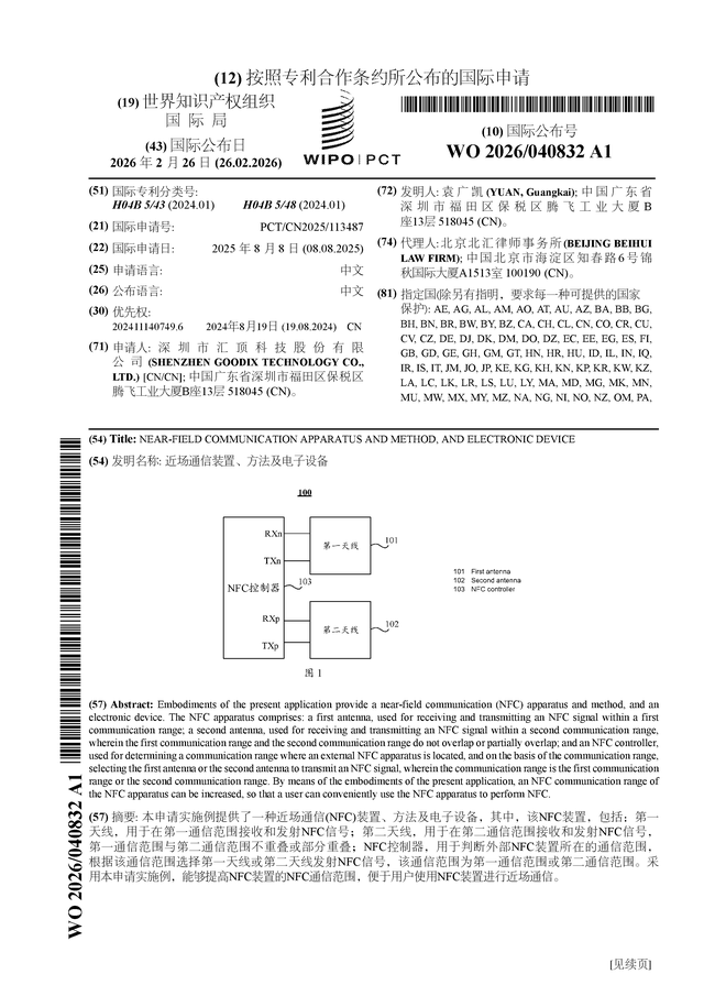 证券之星消息,根据企查查数据显示汇顶科技(603160)公布了一项国际专利申请,专利名为“近场通信装置、方法及电子设备”,专利申请号为PCT/CN2025/113487,国际公布日为2026年2月26日。