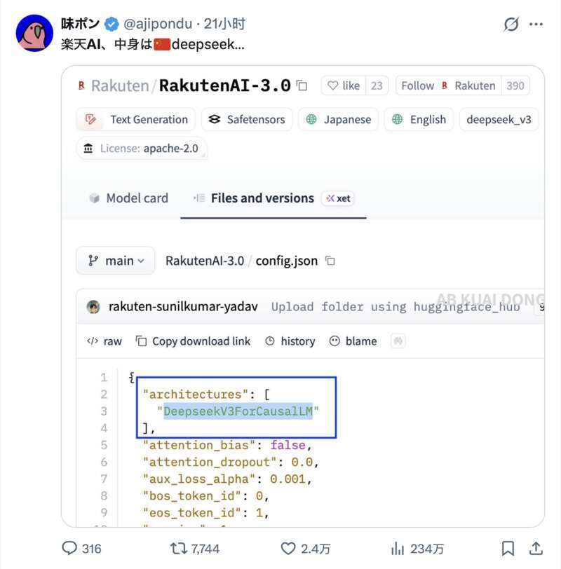 然而,这场精心策划的“国产秀”在发布不到12小时后便遭遇翻车。全球开源社区的技术爱好者扒出其底层代码,发现该模型的核心架构完全源自中国深度求索公司发布的DeepSeek-V3。乐天所做的,仅仅是在此基础上进行了日文数据的微调。