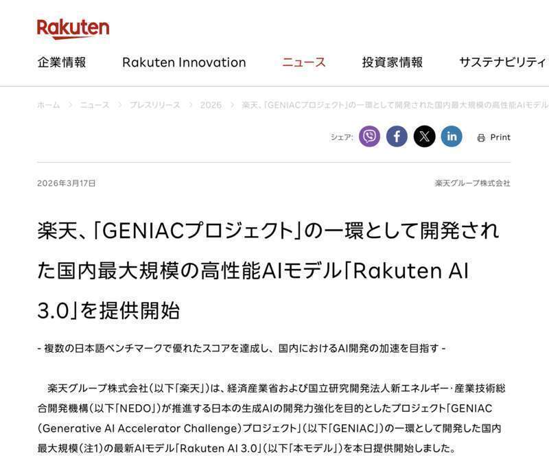 3月17日,日本科技公司乐天集团(Rakuten)高调发布其最新大模型“Rakuten AI 3.0”。该公司宣称,这是在日本经济产业省的资金与算力支持下打造的“日本国内最大规模的高性能AI模型”,拥有7000亿参数,堪称“日本最强AI”。