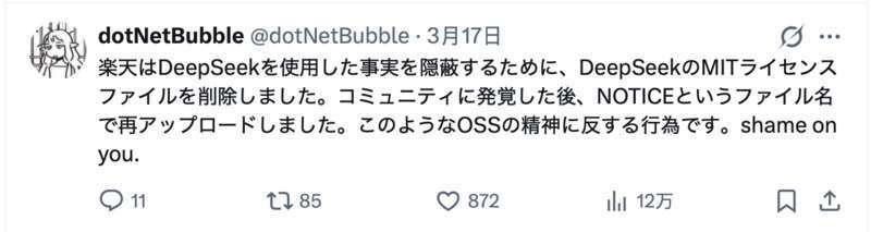 “乐天为了掩盖其使用DeepSeek的事实,删除了DeepSeek的MIT许可证文件。在被社区发现后,才以‘NOTICE’为文件名重新上传。这种行为严重违背了开源软件的精神。真令人不齿。”另一位网友写道。